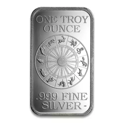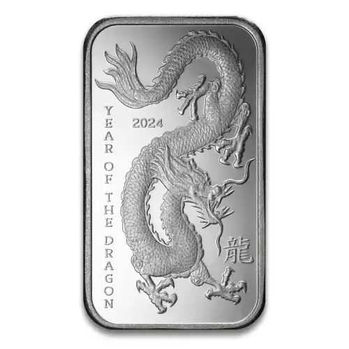 This 2024 Silver Lunar Year of the Dragon 1 oz bar features a design drawn from the fifth animal in the Chinese Lunar Calendar. Struck in .999 pure silver, the reverse portrays a traditional Chinese dragon, along with the words ‘2024 Year of the Dragon’ inscription. The obverse features the Chinese lunar calendar along with the words ‘ONE TROY OUNCE .999 FINE SILVER’ inscribed on the bar.