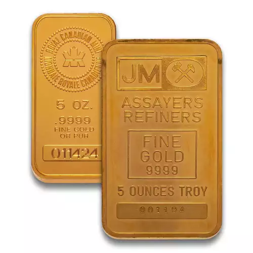 These miscellaneous branded 5 oz gold bars are purchased from a secondary market and minted in .9999 fineness. The bars are issued by various refineries such as (but not limited to); Scotiabank, Johnson Matthey (JM), Engelhard, Credit Suisse, Royal Canadian Mint (RCM), and PAMP Suisse. They are all known worldwide for striking superb precious metal products.