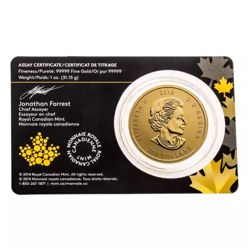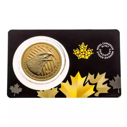 The 2018 $200 1 oz Golden Eagle gold coin is the 5th in the ‘Call of the Wild’ gold coin series issued by the Royal Canadian Mint. Crafted from 99.999% pure gold, this coin is packaged inside a capsule embedded into a striking assay card.