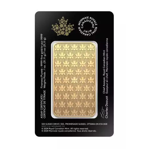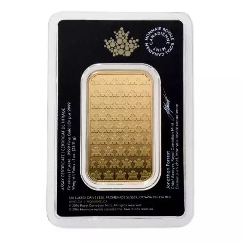 Minted by the Royal Canadian Mint, these highly respected and globally recognized gold bars contains 1 Troy Ounce of .9999 fine gold.